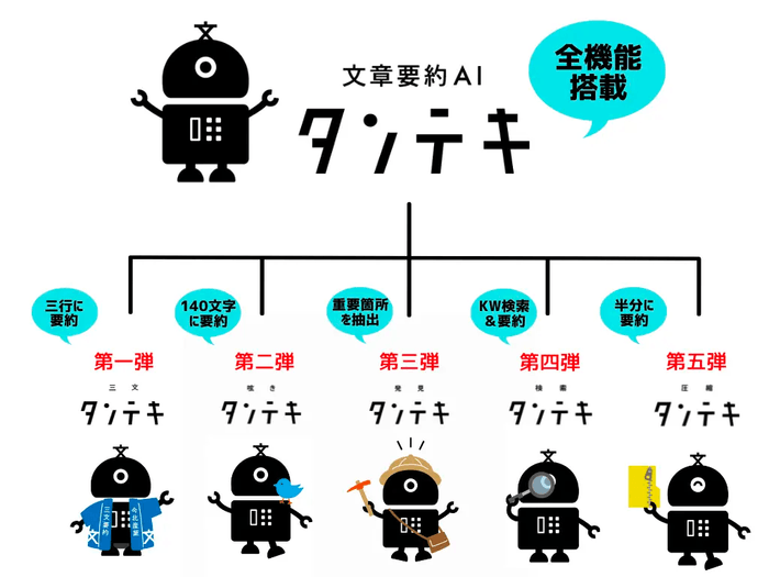文章要約AI タンテキは、独自の自然言語処理エンジンにより、主にニュース記事を中心としたAIによる文章要約を可能としたサービスです。