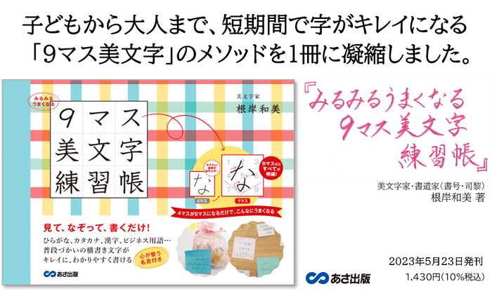 株式会社あさ出版(代表取締役:田賀井弘毅、所在地:東京都豊島区)は、根岸和美 著『みるみるうまくなる 9マス美文字練習帳』http://www.asa21.com/book/b620085.htmlを2023年5月23日に刊行いたします。