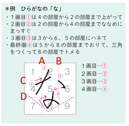「9マス美文字」とは、9マスを使って文字を認識することで、美文字が書けるようになるメソッドです。小学校などで学習する「4マス」ではなく「9マス」を使う理由は、文字の形と組み立てをより具体的に把握し、再現することができるためです。