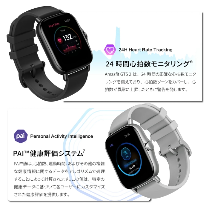 デザイン性と機能性を兼ね備えた「GTS 2」が登場。滑らかな3Dカーブのベゼルレスデザインで、シンプルなのに存在感があります。健康やフィットネスのモニタリングだけではなく、音楽の保存と再生も可能でアマゾンアレクサビルトイン!多機能なスマートウォッチです。