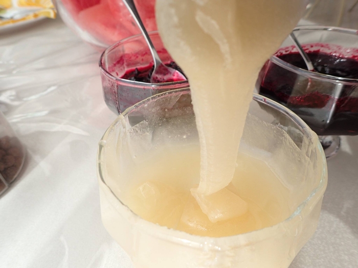 一番人気はクリームみたいな「ホワイトハニー」。他にも6種類の生はちみつや、"花粉だんご"、"生プロポリスボール"など、蜂蜜にまつわる面白い食品もご用意してます。