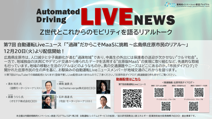 「“過疎”だからこそMaaSに挑戦 ~広島県庄原市民のリアル~」 12月20日より配信 SIP-adus 第7回自動運転Liveニュース