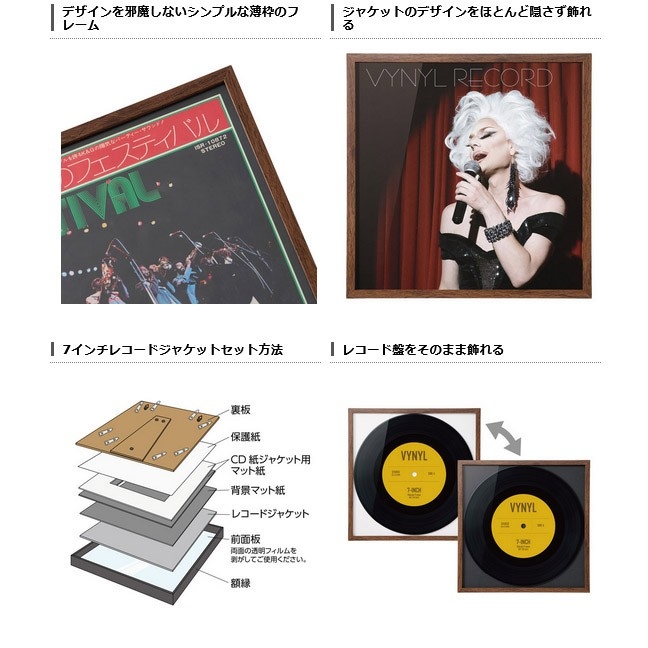 お気に入りの7インチレコードやCDの紙ジャケットを写真や絵画のように飾れるインテリアフレーム。7インチのシングル盤やEP盤のレコードジャケット(180mm角)がピッタリと収まり、写真や絵画のようにお部屋に飾れる薄枠でシンプルなインテリアフレームです。