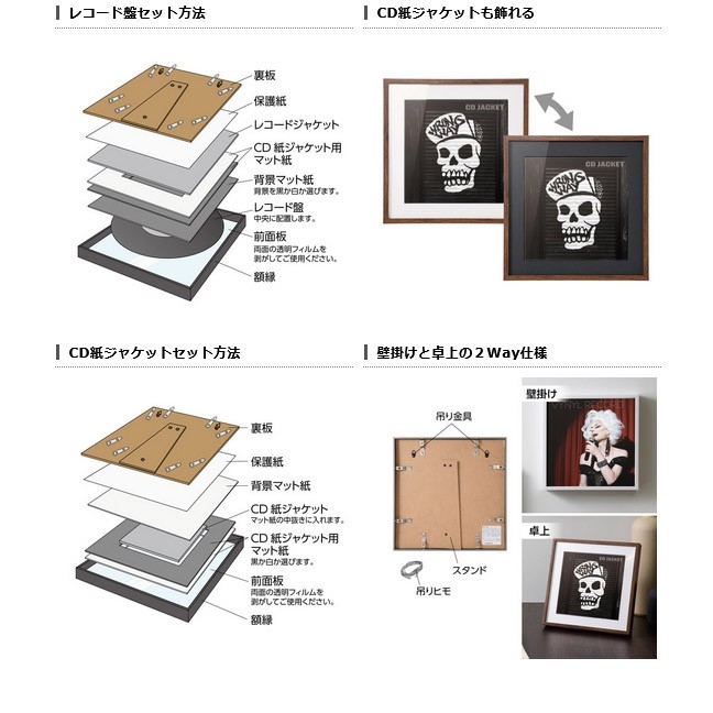 付属の背景マット紙を使用してレコード盤をそのまま飾ることもでき、CDの紙ジャケット(135mm角)を飾れる専用マット紙も付属しています。壁掛けはもちろん、デスクなどにも飾れるスタンド付きです。