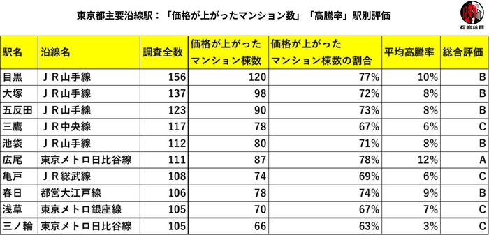 表1:東京都主要沿線駅:「価格が上がったマンション数」「高騰率」駅別評価