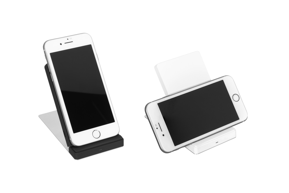 また、本機はスタンドとしても使えます。角度を0~90度の間で調整でき、スマートフォンをお好みの角度で支えられます。充電コイルを2個内蔵しており、縦置き、横置きどちらも可能です。例えば横置きにして動画を観ながら充電といった用途にも対応します。使わない時は厚さ11.5mmとコンパクトに折りたためますので、持ち運びにも便利です。
