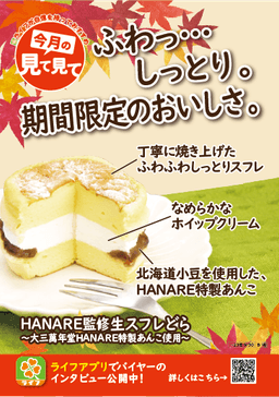 昔ながらの伝統ある味わいを感じつつ、老若男女に好まれる新感覚なスイーツにするため、『和洋折衷・温故知新』をテーマにしている大三萬年堂HANARE様に監修をお願いしました。HANARE様特製のあんことふわっとしっとりのスフレ、ホイップクリームが相性抜群で、見た目もかわいいので、ぜひ家族やご友人と団欒しながらお召し上がりいただきたいです。