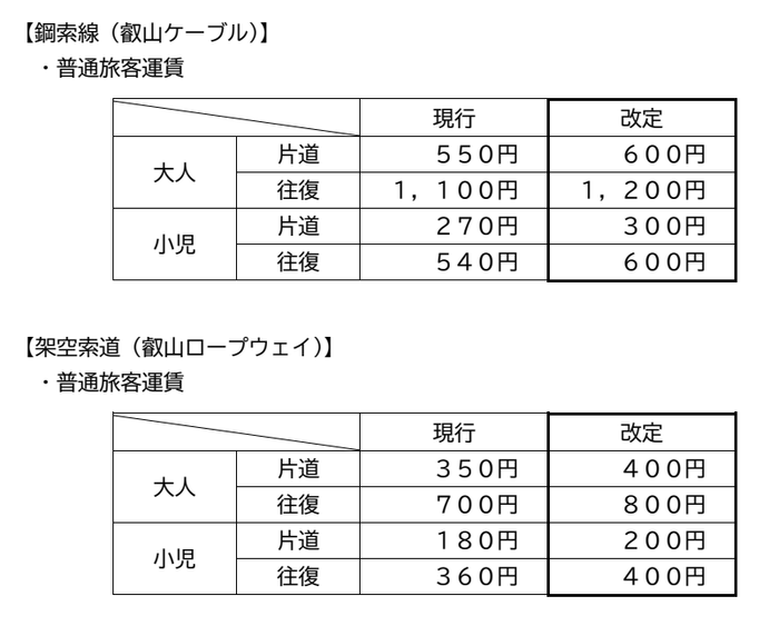 これらを受けて本年4月1日(火)より、叡山ケーブル・ロープウェイの運賃を以下のとおり改定いたしますので、お知らせいたします。