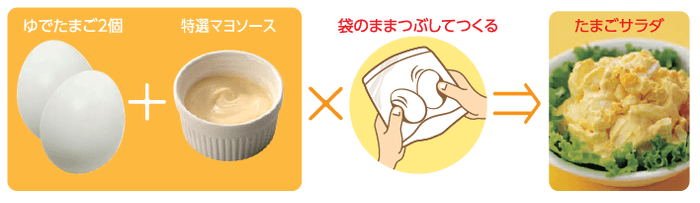 「つぶしてつくろう」シリーズは、ゆで卵が丸ごと袋に入ったチルドサラダです。食べる直前に、袋のままゆで卵をつぶして作るため、作り立てのような黄身の風味や味わいが楽しめます。