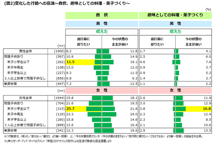 「自炊」が増えたことに対して、小学生以下の子供を持つ父親層では、「今のままが良い」が「流行前に戻したい」を上回るが、逆に母親層では流行前に戻したい割合が多い。ただし、この層は「趣味としての料理・菓子づくり」が増えたことに対しては、現状維持を望んでおり、“義務として”の料理には消極的だが、“趣味として”の料理には積極的な様子が窺える。