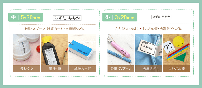 コスパ重視の2本セットは、衣類の洗濯タグにも押せるサイズです。その他、お弁当箱、鉛筆や文具、上靴、小学校でつかう算数セットの計算カード・計算棒など、さまざまな持ち物への名前つけにお使いいただけます。