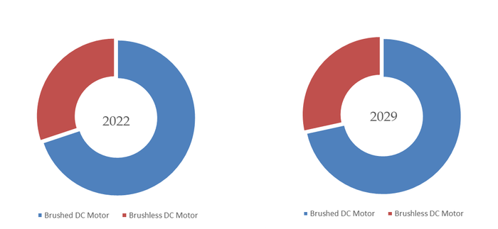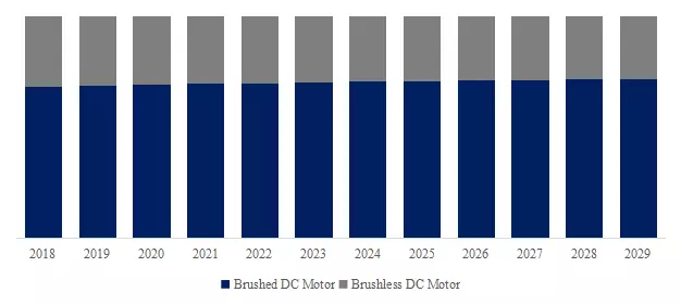 製品タイプ別では、ブラシ付きDCモーターが最大セグメントで、70%のシェアを占めている。
