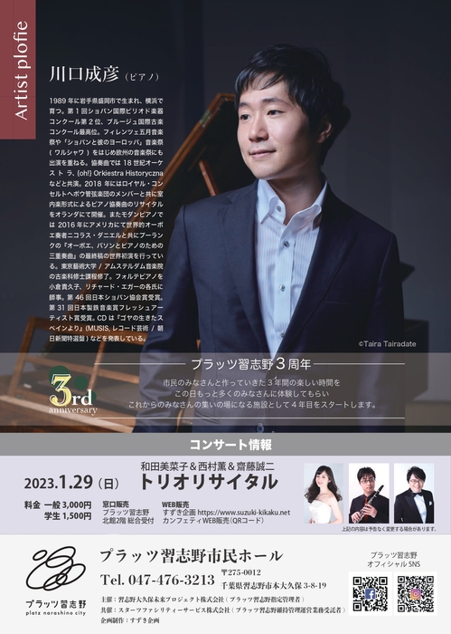 『川口成彦ピアノリサイタル』が2022年12月24日(土) に習志野市民ホール(プラッツ習志野)(千葉県習志野市)にて開催されます。チケットはカンフェティ(運営:ロングランプランニング株式会社、東京都新宿区、代表取締役:榑松 ⼤剛)にて11月1日(火)より発売開始です。