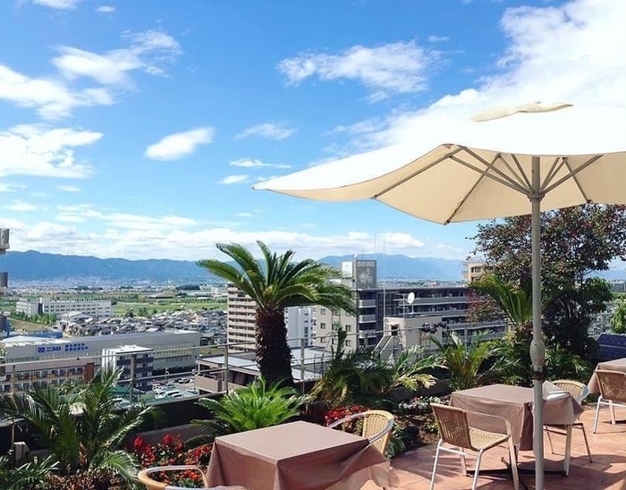鮮やかなスカイブルーのキャンバスに入道雲が浮かぶ。そんな滋賀の空を見下ろせば、地上の雄大な台地と琵琶湖を望める場所が「SORA TERRACE」のカフェテラスです。