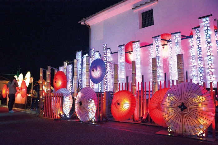風情溢れる豊前街道の古き良き町並みを、和傘や竹を使ったオブジェが鮮やかに彩り、数千もの蝋燭の灯りが幻想的な世界を演出します。その雰囲気は訪れた者の心を打ち、まるで時空を超えたような気持ちにさせてくれます。