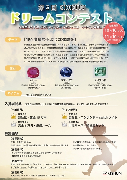 そこで今回、当社の中古宝石を使ったジュエリーデザインを募集し、若い力が活躍するきっかけづくりの一環として『KISHUNドリームコンテスト~180度変わるような体験を~』を開催する運びとなりました。