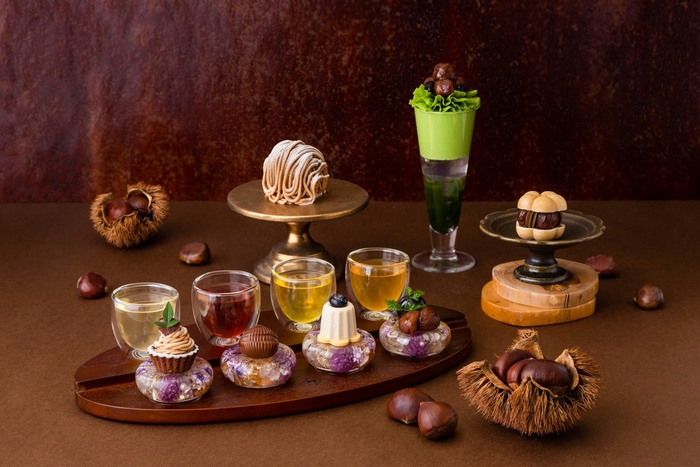 FUKUCHAで人気の宇治茶ハーブティーのペアリングセットの秋冬限定メニューです。それぞれの宇治茶にハーブを掛け合わせ栗スイーツをペアリングしました。シェフ手作りのハーバリウムディッシュで目にも艶やかにお召し上がりいただけます。