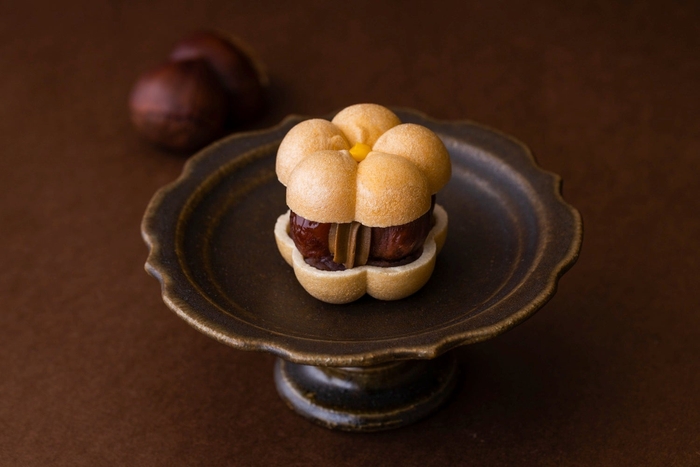 栗と相性が良いこだわりの粒あんに、香り豊かなほうじ茶のチョコレートクリームを合わせ、かわいいお花の形の最中に仕立てました。