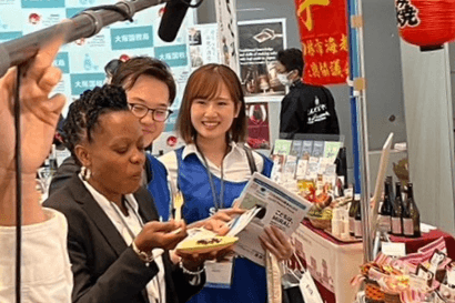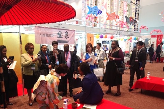 特に印象深かったのは、ケニアのレベッカ・ミアノ・ケニア投資貿易産業長官への通訳です。同長官は一通りブースを見回った後、抹茶のブースでお茶と和菓子の体験をされていました。