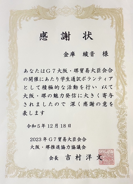 そして、この度、2023年G7貿易大臣会合 大阪・堺推進協力協議会会長吉村洋文(現大阪府知事)から感謝状が贈られ、奥田理事長と宮本学長にご報告しました(2/6)。