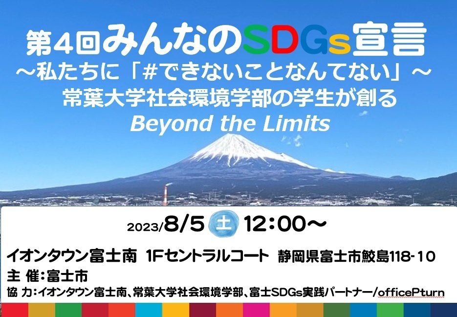 富士市をSDGsで元気にしたい!と活動する富士SDGs実践パートナー(静岡県富士市、代表:岩科 禎修)とofficePturn(オフィスぴーたん)は、常葉大学社会環境学部の学生さんと共に「第4回みんなのSDGs宣言発表会」をイオンタウン富士南店で開催いたします。SDGs(持続可能な開発目標)に共感を持つ多様な方々が集い、地域の未来に向けたアクションやプロジェクトを共有するこのイベントは、地域社会の持続可能な発展をサポートする重要な場となるでしょう。