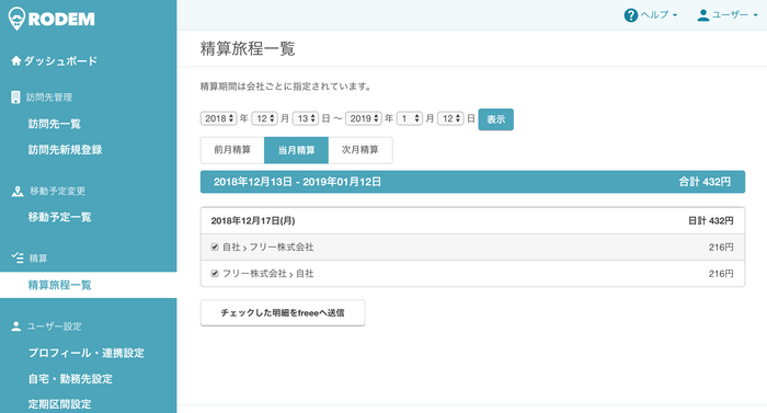 「freee 経費精算API」により「RODEM」の登録内容を経費精算機能に送信