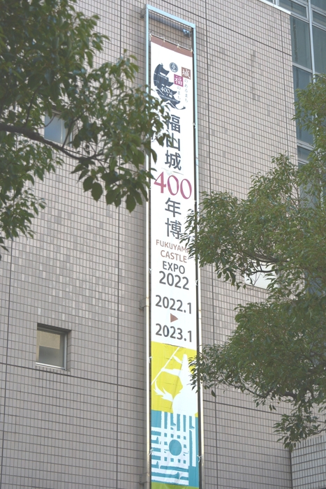 福山城は、今年の8月28日に、築城400年を迎えます。その200日前にあたる2月9日に、市内の公共施設や銀行、郵便局へ、「福山城400年博ーFUKUYAMA CASTLE EXPO 2022ー」の垂れ幕を設置しました!