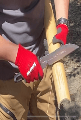 ③ 竹で火起こし体験(サバイバルナイフ実践編):サバイバルナイフで竹に切りこみを入れ、油分で火を起こそう