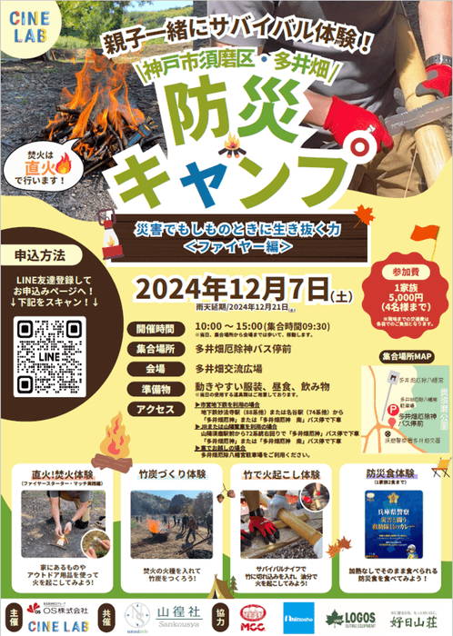 オーエス株式会社(本社:大阪市北区、代表取締役:髙橋秀一郎)は、2024年12月7日(土)に「防災キャンプ!災害でもしものときに生き抜く力<ファイヤー編>」を神戸市須磨区の多井畑交流広場にて開催します。本イベントでは、災害時に不可欠な火の確保方法と火に対する正しい知識、安全な道具の使い方を楽しく学びます。火起こし体験を通じて、ご家族連れで楽しみながら防災スキルを見つけられる貴重な機会です。自然のなかで、災害時に役立つスキルと知識を身につけましょう。