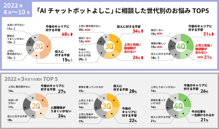これまでよしこママに寄せられた相談件数は13万件以上にのぼります。2022年3月までに寄せられた悩みと4月以降に寄せられた悩みを比較してみると、20代~40代の各年代ともに「今後のキャリアに対する不安」や「収入に対する不安」が上位にランクインしています。また、4月以降には「上司に責任感がない」「上司と性格/価値観が合わない」といった上司に対する悩みが各年代通してランクインする結果となりました。今後は、服装に関する悩みの選択肢を追加したことで得られる悩みのデータを分析し、お客様へのご案内に生かすなど積極的な活用を検討していきます。