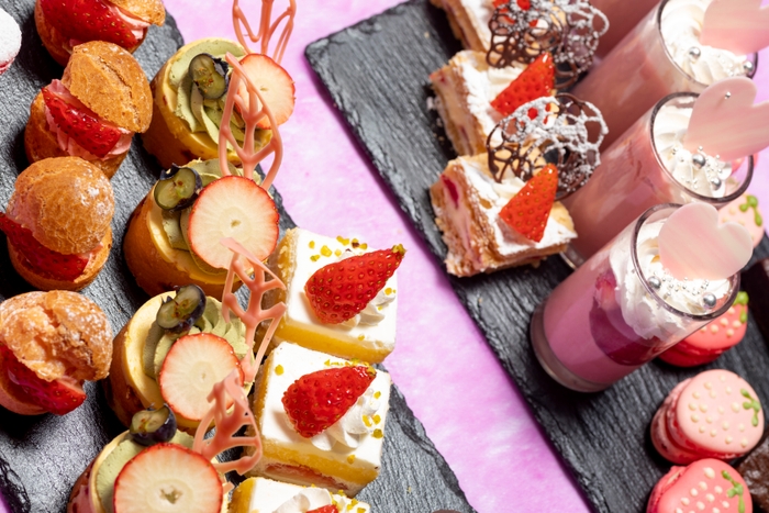 キュートなイチゴ型やハート型の『マカロン』、サクサクのパイ生地とイチゴの層が織りなす隠し味のホワイトチョコが決め手の『ミルフィーユ』。美らイチゴのジュレをサンドしたオリジナルフレジエ風ケーキの『ガトーフレーズ』。