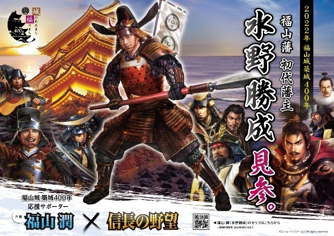 広島県福山市では、福山城天守前広場東側(福山城博物館管理事務所前)の工事用囲いに「信長の野望」コラボデザインシートを設置します。