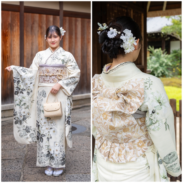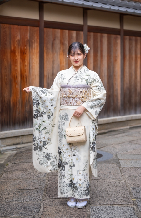 成人式で着る物ほどきらびやかで無く,程よい落ち着いた雰囲気の色柄で、京都の美しい街並みの中に自然と溶け込むデザインとなっています。観光の際にも、周囲の景色と調和しつつ、特別な日の装いとして華やかさを添えることができます。