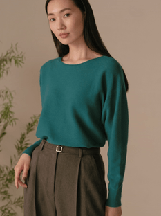 デコルテがきれいに見えるボートネックライン風な襟ぐりは、開きすぎないネックラインにこだわりました。袖口はややパフ感を出し、スッキリしたデザインの中にやわらかい雰囲気と女性らしさをプラスしています。裾はストレートにし、スカートにもパンツにも合わせやすいデザインにしました。