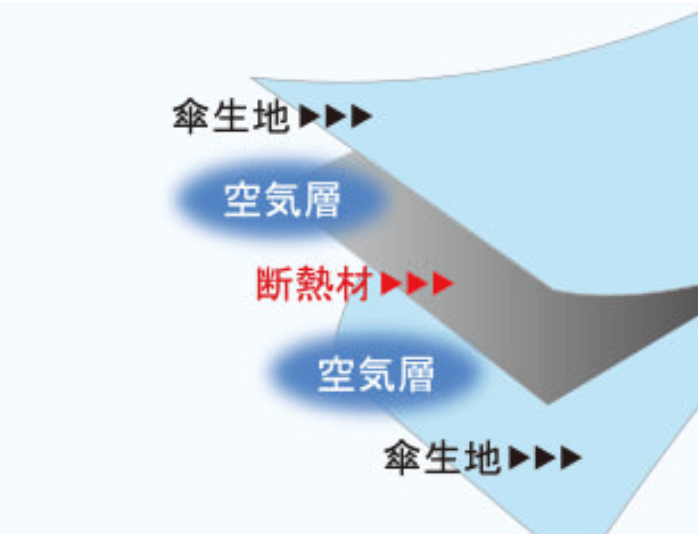 傘の生地と生地の間に特殊な断熱シートを挟むことで、傘内側の温度上昇を軽減させることを実現させました。