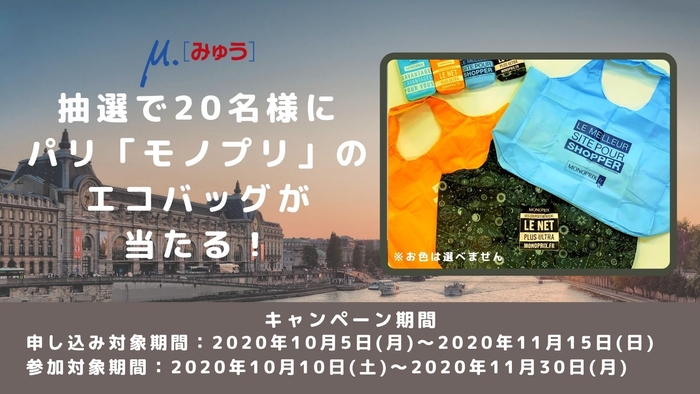 [みゅう]オンライン体験ツアー(商品名に【オンライン体験ツアー】と記載がある商品)を、対象期間中ご予約いただき、ご参加後にマイページから口コミをご投稿いただいた方の中から、抽選で20名様にパリ「モノプリ」のエコバックをプレゼントいたします。