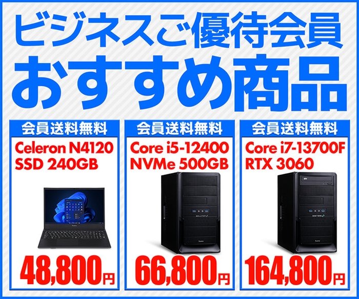 ビジネスご優待会員様向けに『ビジネスご優待会員 おすすめ商品』を実施中です。担当スタッフがおすすめするパソコン、中古商品、PCパーツ・周辺機器をズバリ価格でご用意しております!この機会にぜひご購入検討ください。