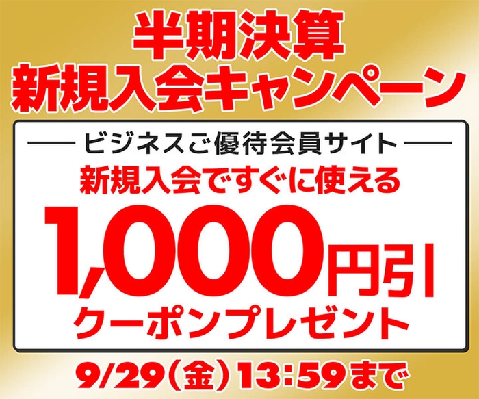 法人・個人事業主様専用「ビジネスご優待会員サイト」では、キャンペーン期間中にビジネスご優待会員に新規登録をされたすべてのお客様に、今すぐ使える1,000円(税込)引きWEBクーポンコードをプレゼント中です。更に今ご登録いただくと、現在実施中のビジネスご優待会員サイト『ビジネスご優待会員 おすすめ商品』がご覧いただけます!登録・会費は無料ですのでこの機会にぜひご登録ください。