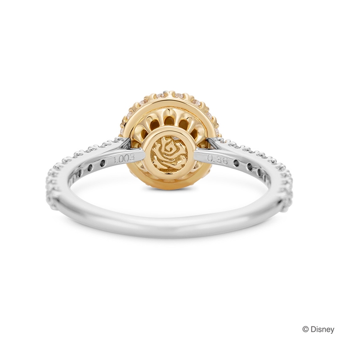 1.0ct台のシンプルながら華やかなラウンドカットダイヤモンドがセンターに輝くデザインです。大粒のダイヤモンドを支える石座は、「ベル」と「野獣」が心通じ合い踊るボールルームの装飾をイメージ。34ピースのメレダイヤモンドがきらめきを添えます。石座の裏側に、真実の愛へと導いた「魔法のバラ」のモチーフをデザインしています。