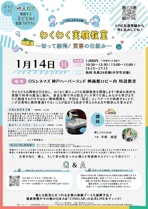 映画館を街のにぎわいや文化の情報発信基地として活用するプロジェクト「CINE LAB(シネラボ)」を展開するオーエス株式会社(本社:大阪市北区、取締役社長:髙橋秀一郎、以下オーエス)は、体験学習を通して子どもたちの選択肢を広げ興味の開発を行う株式会社こどもCandy(本社:神戸市中央区、代表:手塚麻里、以下こどもCandy)とコラボレーションし、「防災を楽しく学ぼう!」をテーマにした小学生向けの体験型ワークショップ「わくわく実験教室!~知って納得、災害の仕組み~」を、2024年1月14日(日)に映画館OSシネマズ神戸ハーバーランドのロビーにて開催いたします。