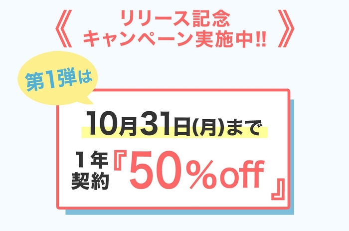第1弾は1年一括契約を『50%off』でご案内。10月31日(月)までに契約すると、その後の更新も ずっと半額で利用できるお得なキャンペーンです。