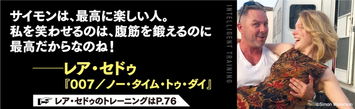 すべての007 シリーズで、私はできるだけたくさんのスタントをこなしたかった。それができたのは、身体づくりに対するサイモンのスマートなアプローチと、トレーニングだけでなくリカバリーと栄養にも注目する彼のやり方があったからだ。サイモンと仕事ができたことを光栄に思う。
