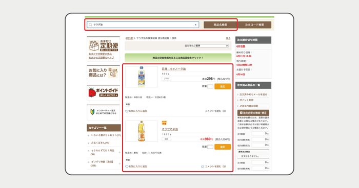 例:「サラダ油」と検索すると、「キャノーラ油」「米油」など検索ワードと関連した商品が表示されます