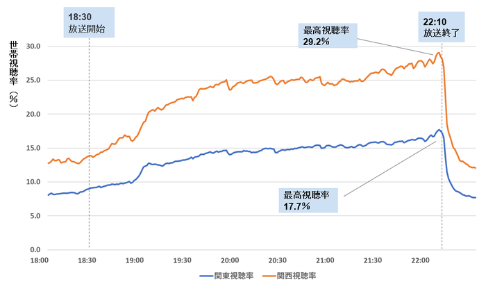 最高視聴率は番組終了間際の22:06で、関東では17.7%、関西では29.2%を記録しました。この時間は優勝者が発表されるため、多くの人が視聴したと考えられます。