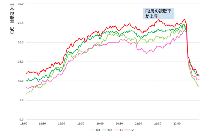 最も視聴率が高かったのはF2層で、最初から最後まで、他の層より常に高視聴率を維持していました。