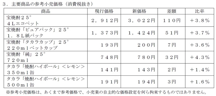 宝酒造株式会社は、焼酎甲類(連続式蒸留焼酎)ならびに一部ソフトアルコール飲料等の価格を2022年6月1日出荷分より改定いたします。改定後は参考小売価格で1〜8%程度の引き上げとなります。