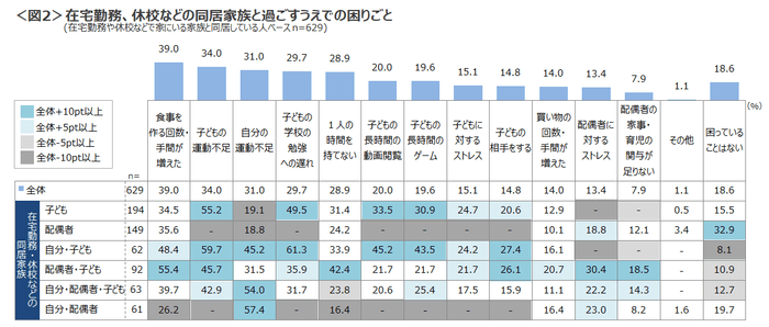 在宅勤務や休校などで家にいる同居家族と過ごすうえでの困りごとは全体で「食事を作る回数・手間が増えた」が39.0%で最多。そのほか「子ども・自分の運動不足」「子どもの勉強の遅れ」が約3割で上位に。また、休園や休校で在宅している子どもを持つ親の困りごととして「1人の時間を持てない」も目立った(詳細はダウンロードレポート参照)。
