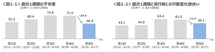 直近1週間の不安度は前回の第4回からマイナス24.5pと大きく減少し、46.9%と調査開始以来最も低い数値を記録。<図1-1>直近1週間と新型コロナウイルス流行前との行動変化度合いもマイナス11.4pとなった。<図1-2>39県に緊急事態宣言の解除がされたこともあり、人々の意識や行動においてネガティブな要素が減りつつあることが判明。