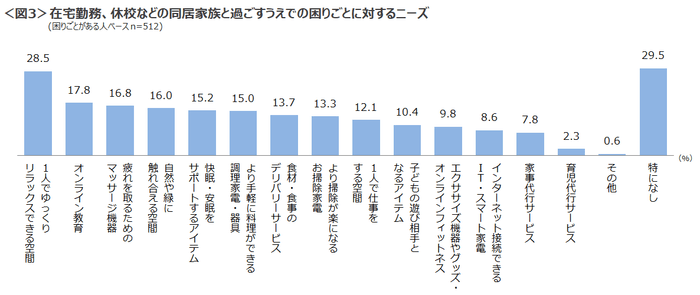 困りごとに対するニーズでは「1人でゆっくりリラックスできる空間」が最も高いことが判明。物理的な商品やサービスで困りごとを解消したいというよりも、1人で過ごせる時間や空間を求める気持ちが顕著になった。<図3>