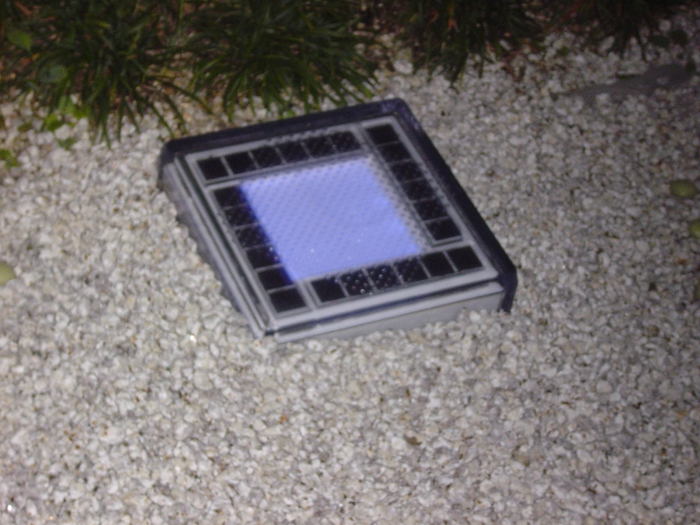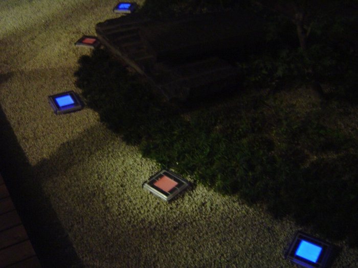約10坪の庭。植えられた美しい木々を活かし、大規模な工事をすることなく夜景を演出できる方法はないだろうか?と考えました。そこで頭に浮かんだのが、光るタイル「タガワタイル」でした。この商品は、環境にやさしいソーラーパワーを利用したメンテナンスフリーなLEDです。ガーデニングアクセサリー、庭の夜間照明、玄関アプローチの誘導灯、かーポートの入り口照明などとして活用されています。また、機能性という面でも魅力があります。直射日光下では約1時間で充電し、日没より約12時間、自動点灯します。